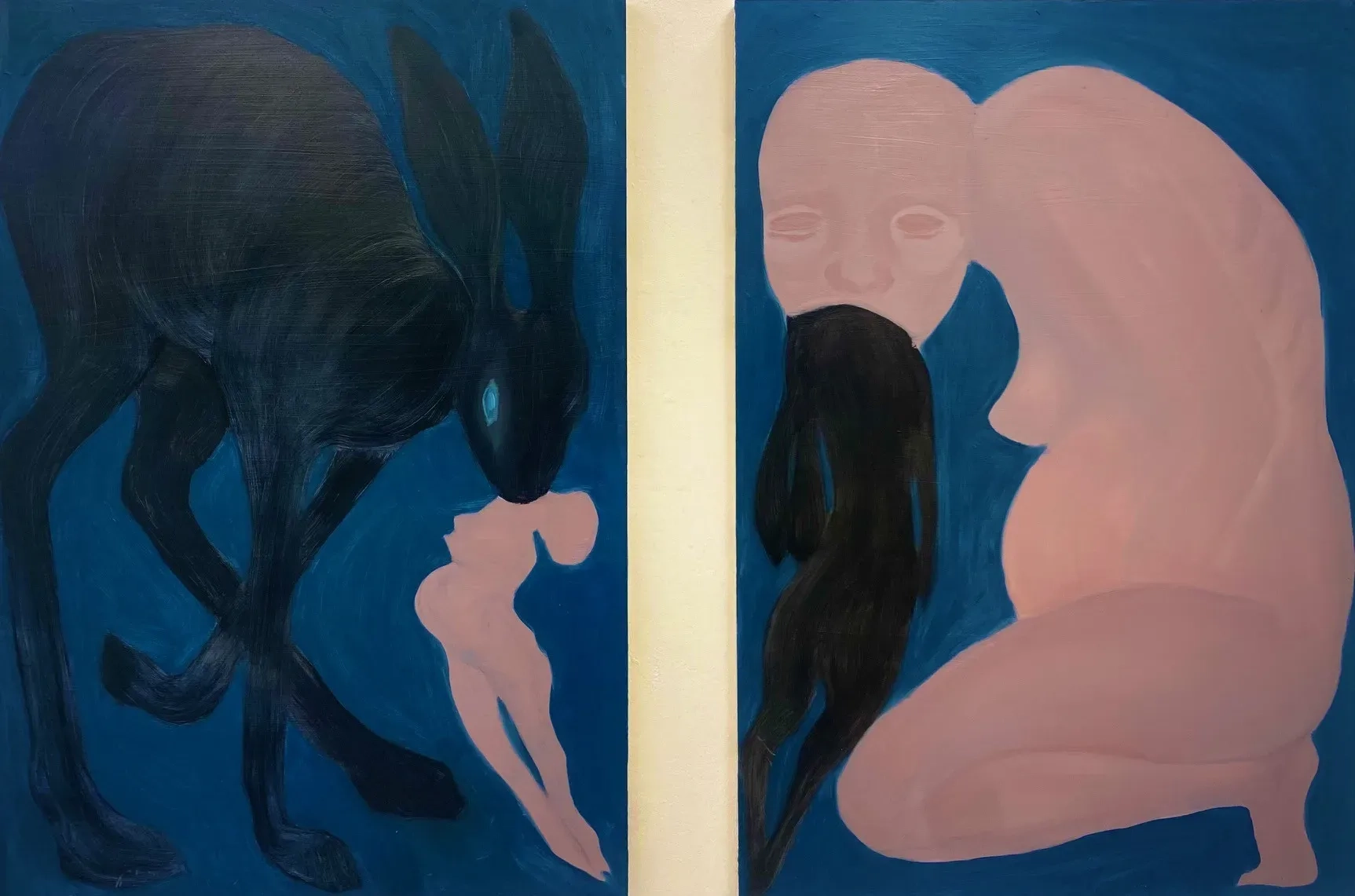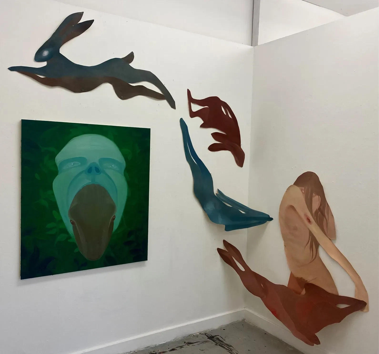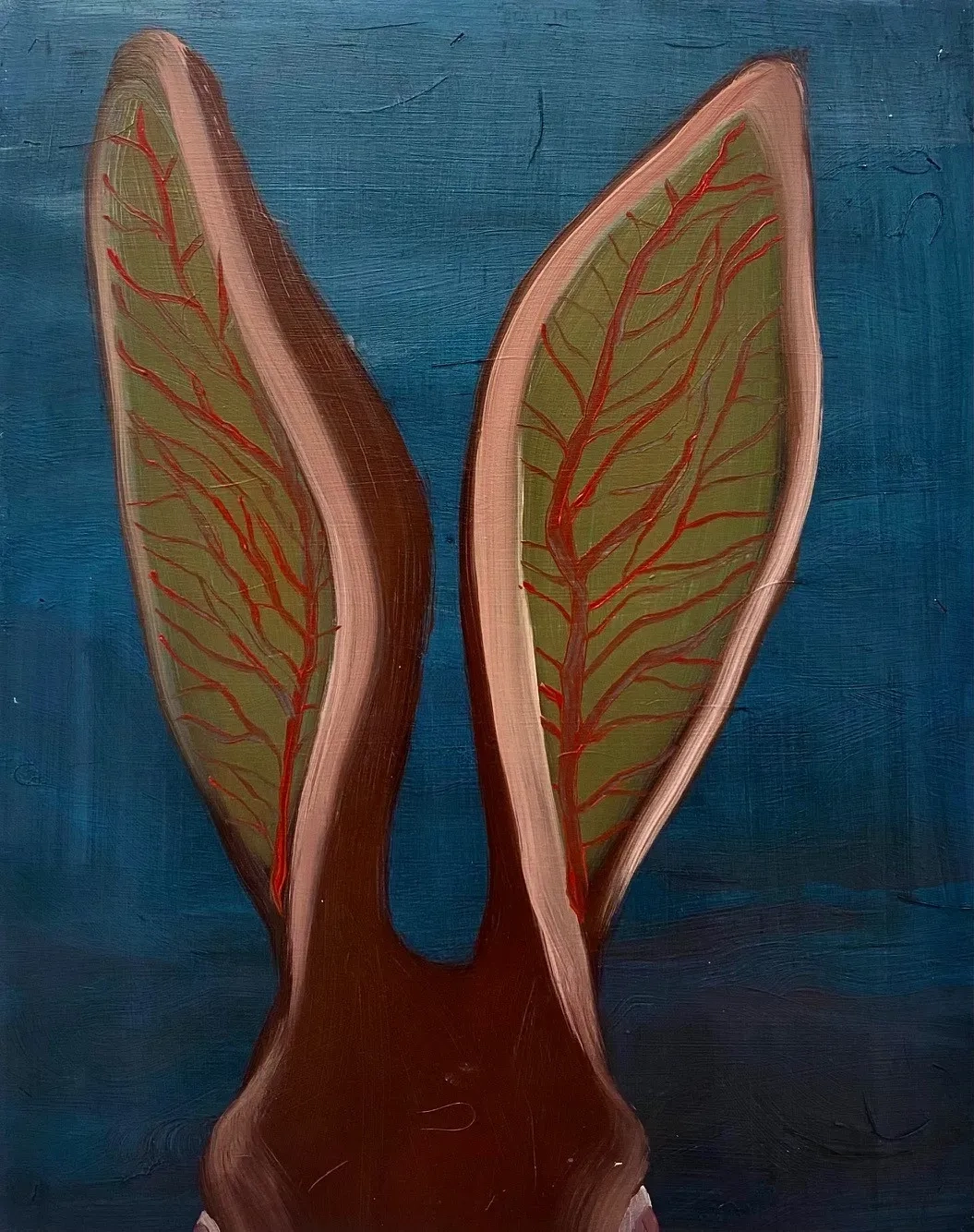 Síofra’s art delves into the parallels between old local folktales and the wavering and ever-shifting relationship between nature and humanity. This collection began with her fascination with the various folktales tied to Ireland’s native animals. In her work, she examines creatures that are imbued with eerie associations, often portrayed as sinister or deceptive. The hare, in particular, has long been linked to witchcraft, with tales of it consuming human flesh, stealing from people, and even witches taking the form of hares with malevolent intent. The hare’s flighty, nervous demeanor is what brought these superstitions upon the creature, and this uneasy, mistrustful behaviour is captured within Síofra’s work with strange imagery and compositions. Within local and neighboring countries’ folklore, there are countless tales of hares being shot and soon after a woman would appear with an identical wound.