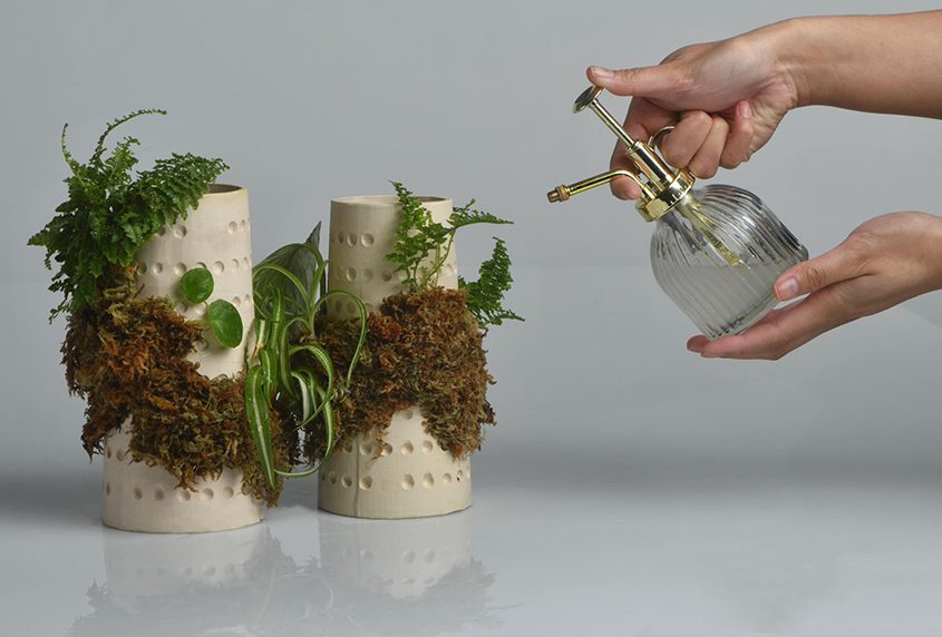 This work examines the rapid urbanization and environmental changes in Ireland, and its impact on the loss of green spaces. With that as my driving force I designed a product that aims to conserve and safeguard nature by integrating it into our daily lives. This goal is accomplished through a combination of Aeroponics, a conventional plant watering method, and state-of-the-art 3D printing technology to create self-watering plant pots that support plant growth on the surface of the ceramics. This work is designed to cater to the specific needs of cramped urban apartments and busy lifestyles. My aim is to make a difference in the lives of individuals residing in cities by emphasizing the significance of nature and providing them with an opportunity to reconnect with the natural world.