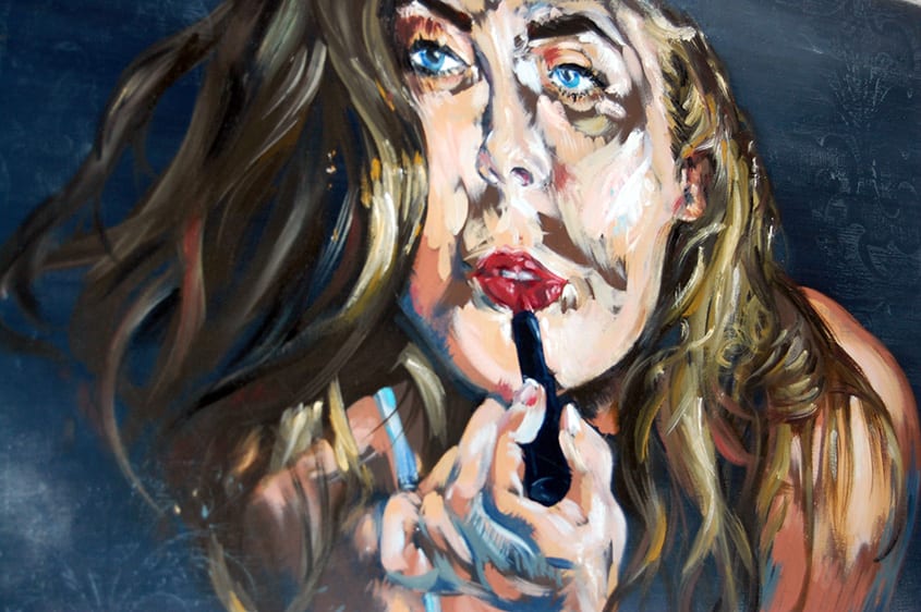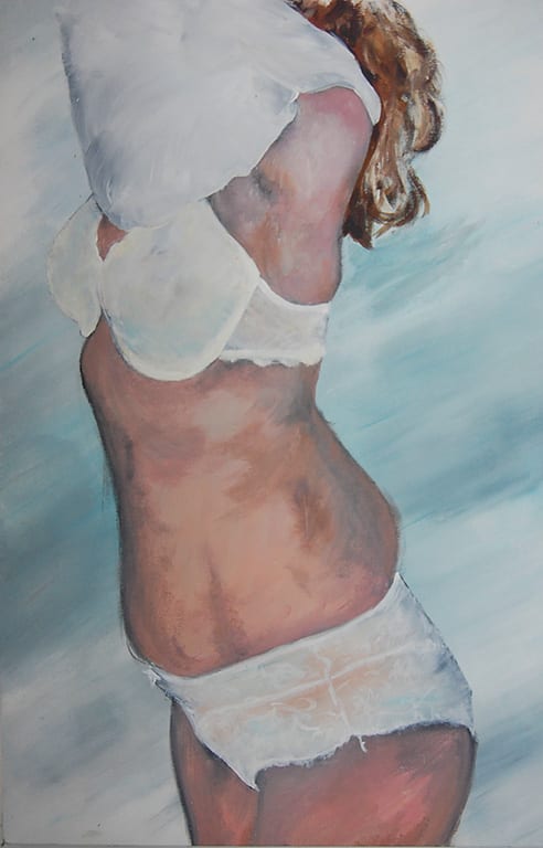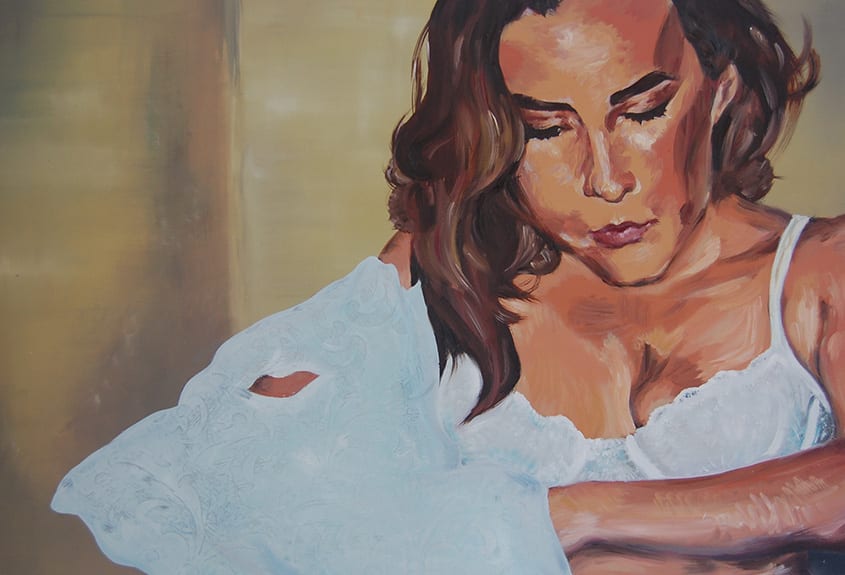 Sophie McGrath’s painting practice focuses heavily on the female body in conjunction with themes of femininity, beauty and sexuality which is evident in her body of work. Her work addresses the female in the context of a typical, everyday woman, carrying out routine tasks such as dressing oneself. Her subject is arguably an archetype of female beauty in contemporary society and her paintings initiate an instant dialogue with the viewer which challenges stereotypical representations of female beauty. However, while a perceived social commentary is welcome here the purpose of this particular work is solely to portray the female body as a raw and natural object of beauty and celebration.