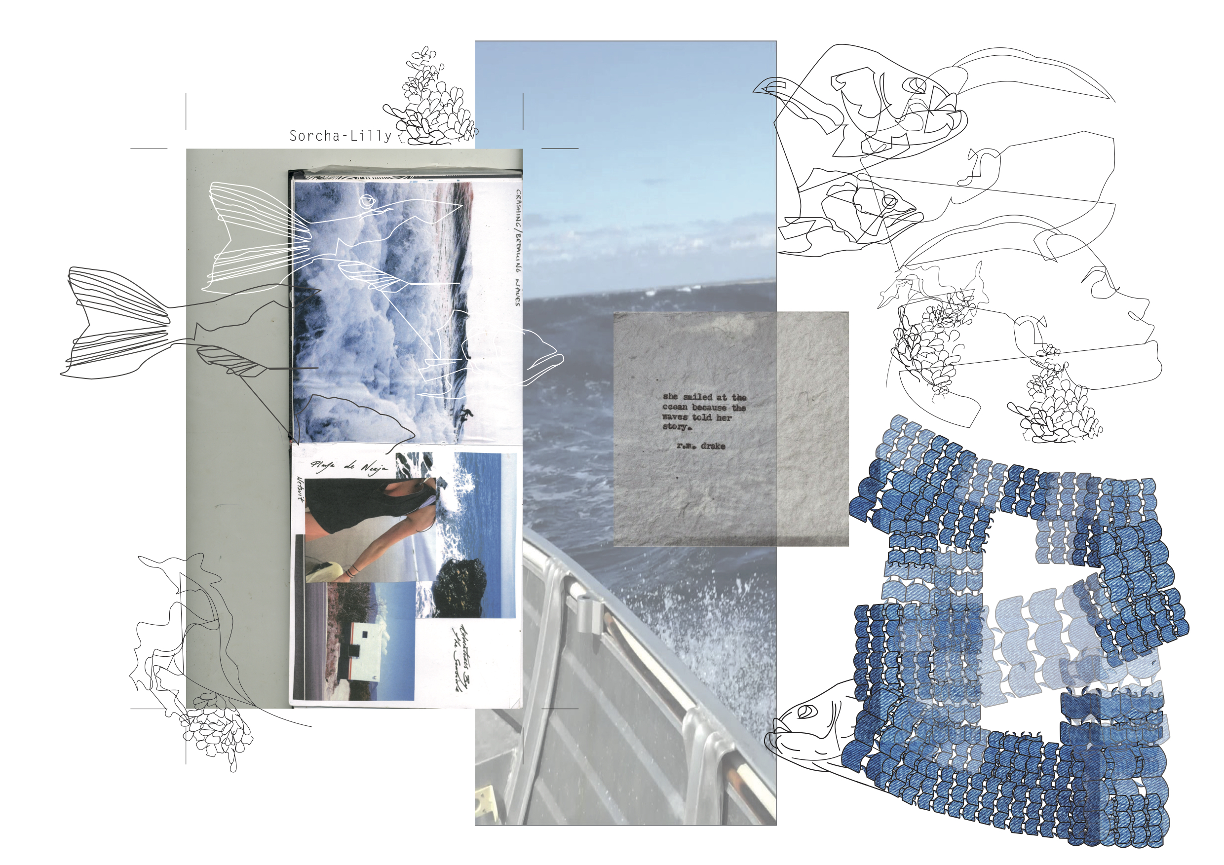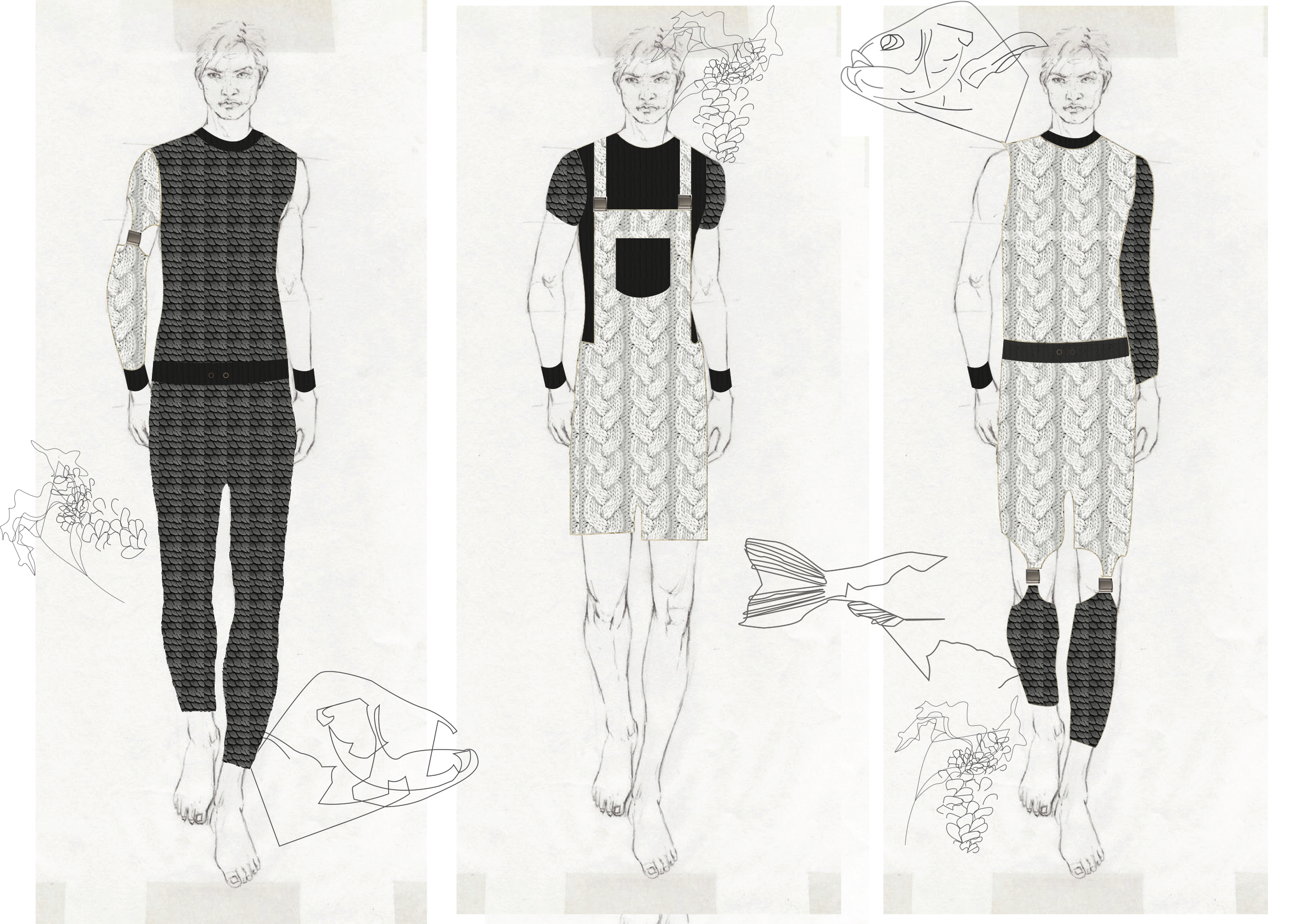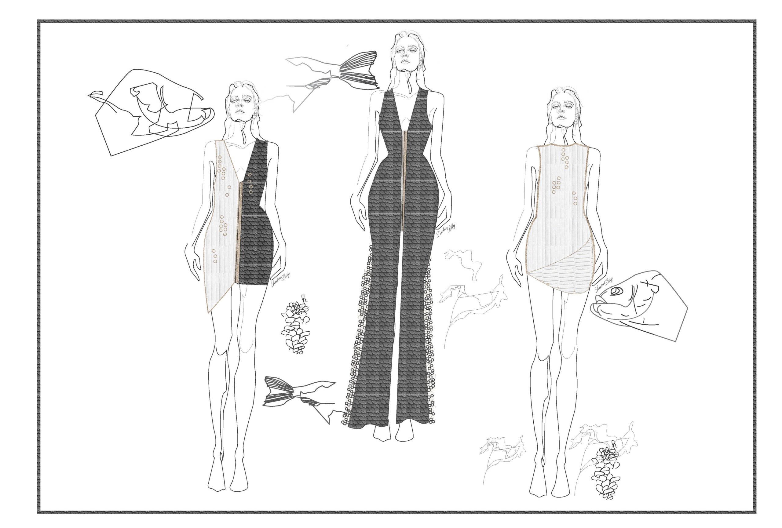 Incorporating the fusion of both body and nature to become one. Thorough textiles inspired by the fisherman jumper combined with nets, scales and armor- through the use of natural and man-made materials such as 100% cotton and silk with contrasting metal embellishing. An entwined battle between the landscape and human relationship.