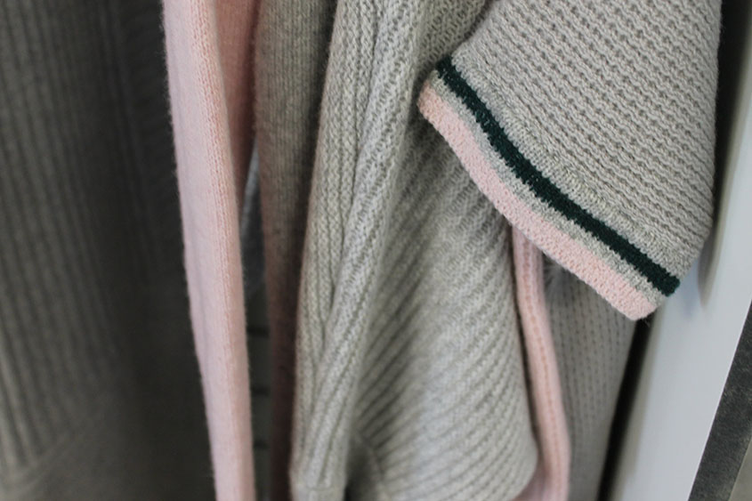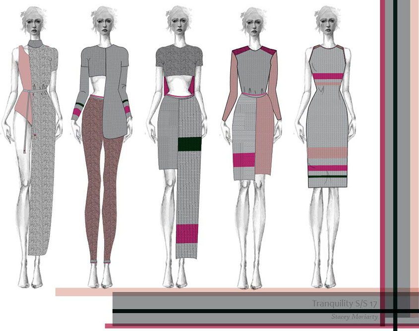 My collection was inspired by the gate outside of our main building on Clare street. The metal gate has linear lines of different width and a parallel line running through and breaking the lines. Under the break the metal linear bars of different widths start again but not in the same order as the top, making it just slightly off. This was something that really caught my attention and made me start to think of different ways clothing cuts the body. My pieces are made up of panels each of different textiles and of different lengths again like the gate, two sides different but working together as one. I have always been drawn to rib structures in knit so they were also an obvious choice when I was looking at lines. I wanted to explore and experiment more with the different techniques and ways of using ribs also. My colour story is also from one of my own images I took from my mother’s flowers. The colours are very feminine and soft. I felt that this would be a good contrast to the harsh lines I wanted to create in my pieces. My collection has a sportswear feel and I wanted that to be made clear. The pieces are all very easy to wear and comfortable and with the colour story I have chosen is a very soft and easy to look at palate hence the name of my collection ‘Tranquillity’.