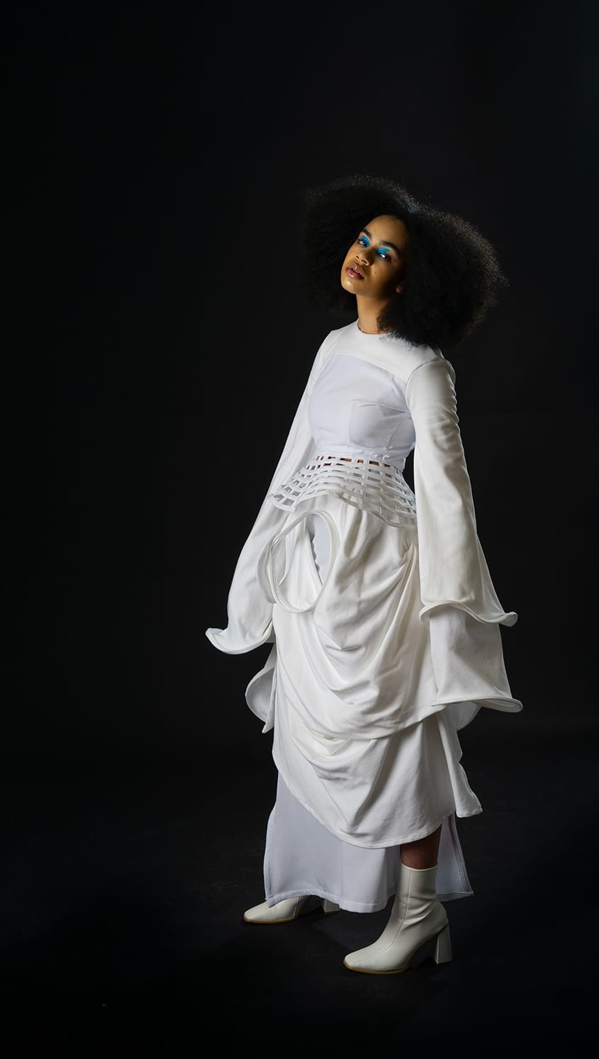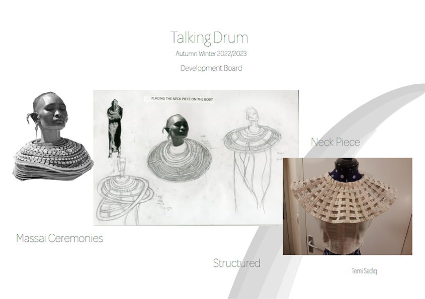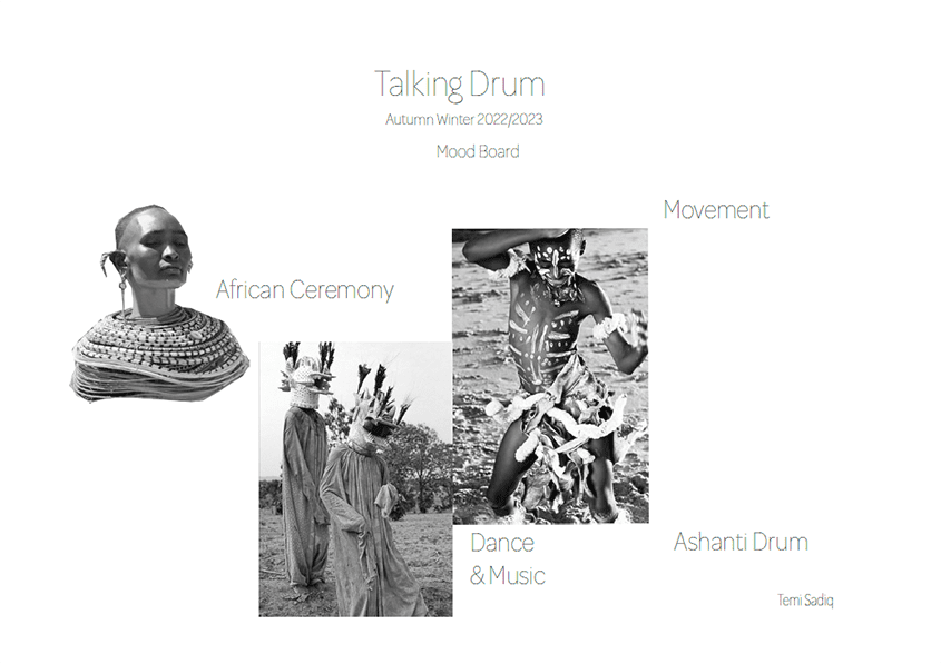 My collection is inspired by my African Upbringing and love for music. As music and dance are a vital part of African ceremonies, I have focused on exploring the concept of the importance of music and dance in African ceremonies focusing on the drums one of the most prominent instrument’s when it comes to music across a lot of African ceremonies. My looks are inspired by Ashanti drumming which is a method of drumming used to communicate when played, it’s also referred to as the talking drum, the cohesive method combines structure with a sense of flow and movement, I translated this in my collection through the use of drape for flow and movement and boning for structure to create a cohesive collection that embodies the Ashanti drums.