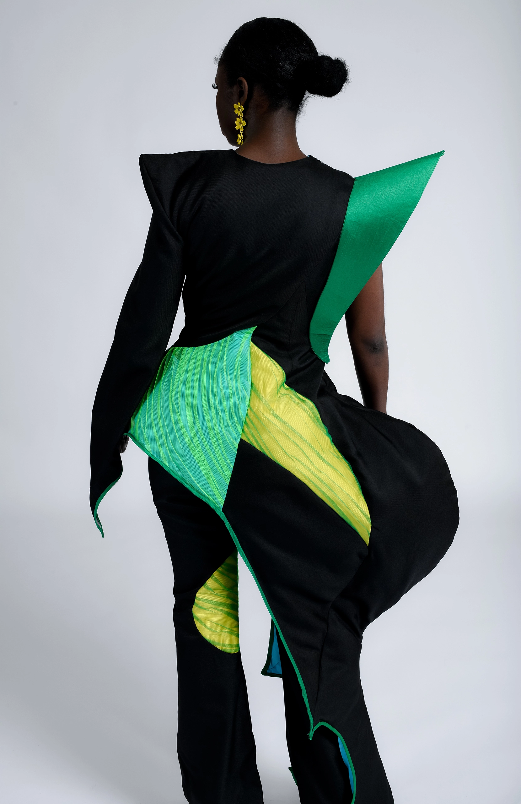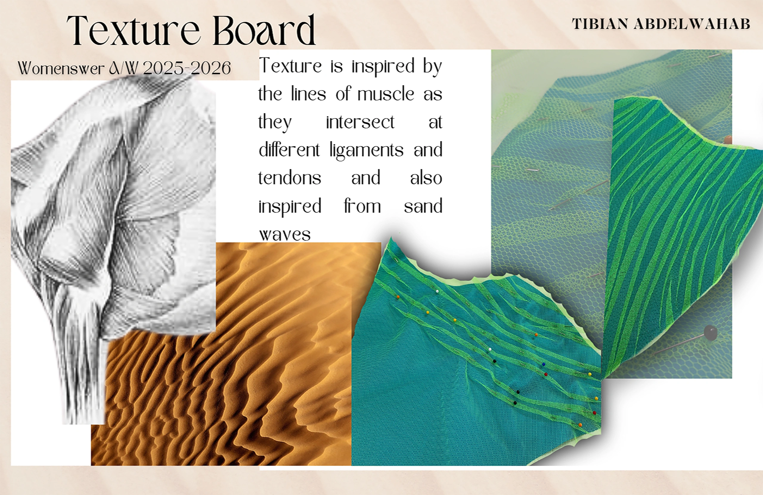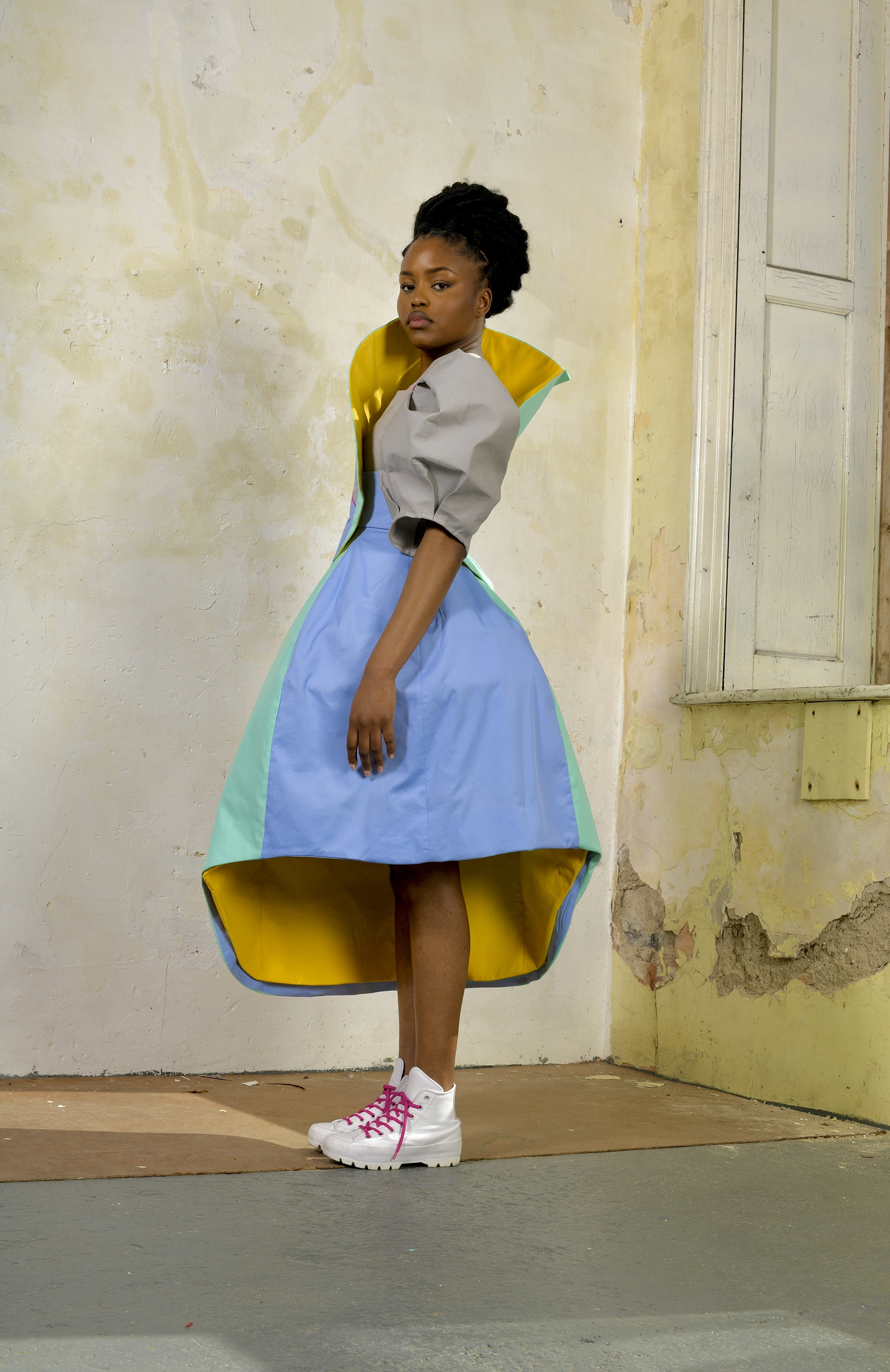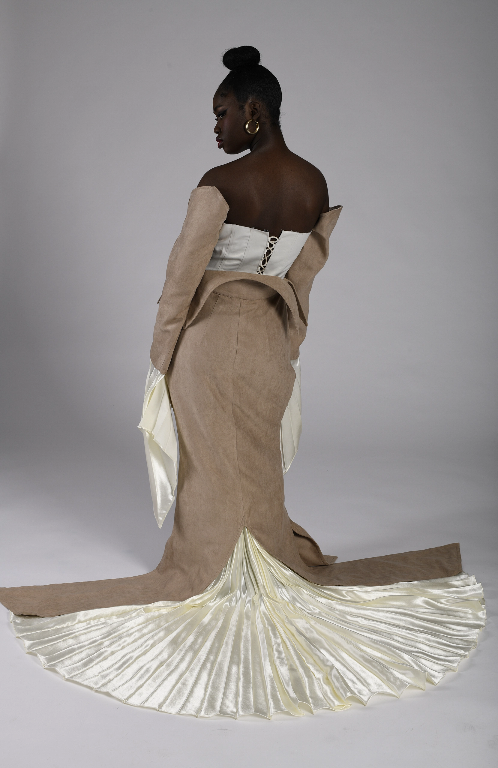 Arriving in Libya meant stepping into a country that was not my own. There was a constant push and pull between preserving my identity and blending into a new culture. This duality is represented in the silhouettes—traditional Sudanese draping fused with Libyan tailoring, flowing garments interrupted by structured seams, symbolizing moments of both belonging and displacement.
