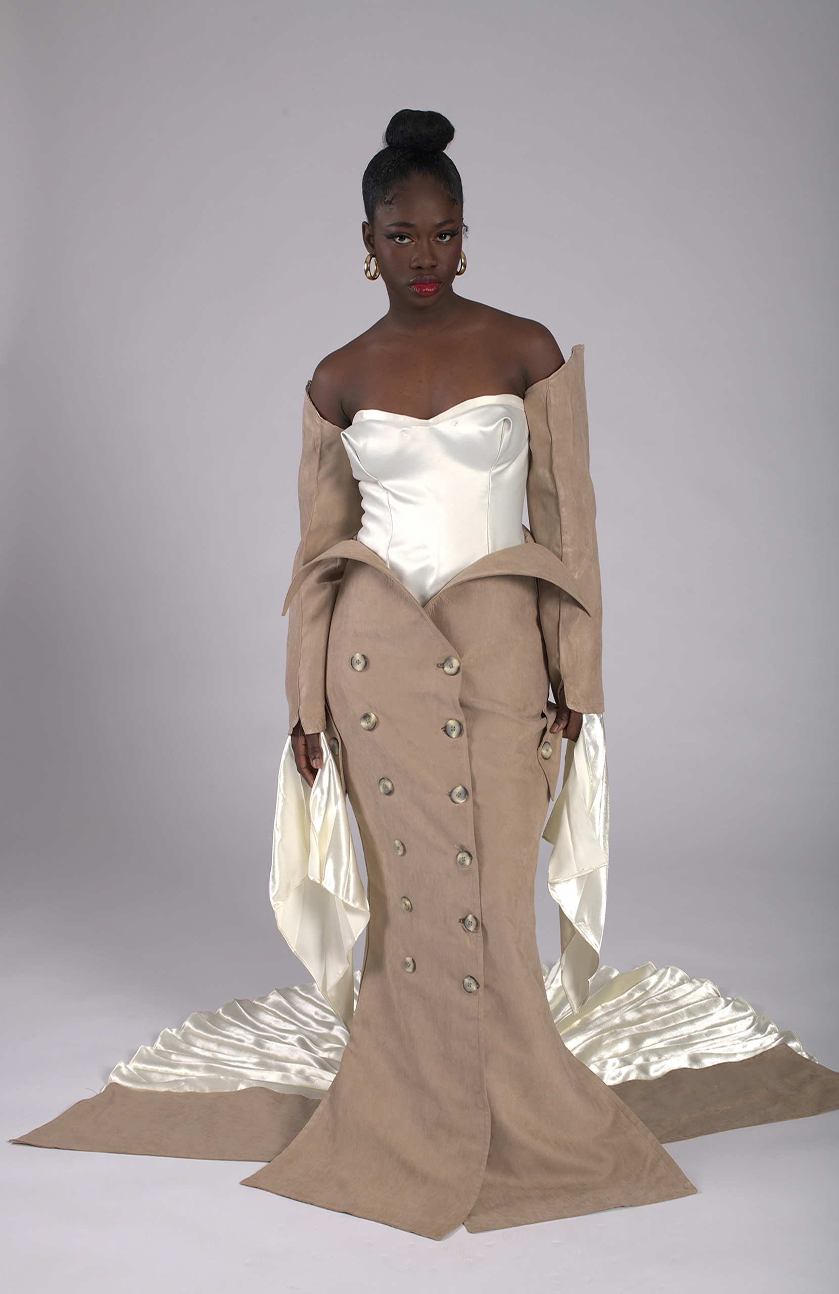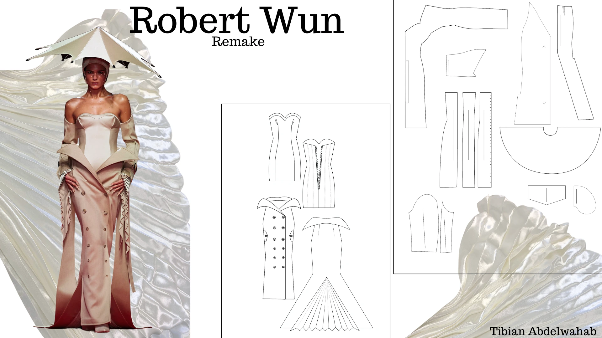 This design is a bold recreation of one of Robert Wun’s couture dresses signature aesthetic, transforming a tailored trench coat into an avant-garde skirt. The trench, reimagined from its utilitarian origins, features sharply extended lapels that drape over the hips like sculptural panels, creating architectural volume and movement. Traditional double-breasted buttons are retained, offering a nod to classic tailoring while grounding the design in familiar sartorial language. At the back, a dramatic train cascades to the floor in pleated crepe satin, evoking elegance with a sense of fluid motion, balancing the coat’s structure with softness and luxury.
