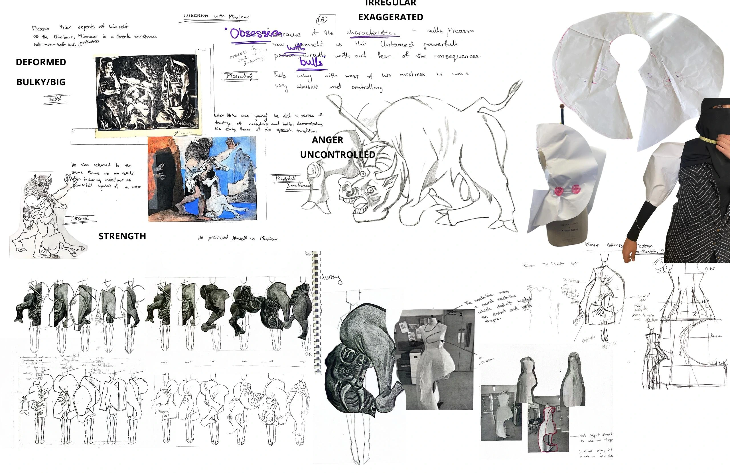 Abstraction through evoked emotions Picasso expressed through out his work. It conveys deep psychological states, with unevenness and distortion to break conventional ideas, unpredictability of emotions is mirrored in the imbalance of silhouettes that reflects the push and pull of human feelings. My collection is a bold exploration of abstract emotions, inspired by the expressive and unconventional works of Pablo Picasso. Through abnormal shapes, unevenness, and a playful obsession with distortion, each piece challenges traditional fashion norms, transforming garments into wearable art. Contrasting fabrics—structured and fluid, smooth and rough, sheer and opaque—enhance the tension within each piece. This interplay mirrors the complexities of human emotion, where chaos and harmony coexist.