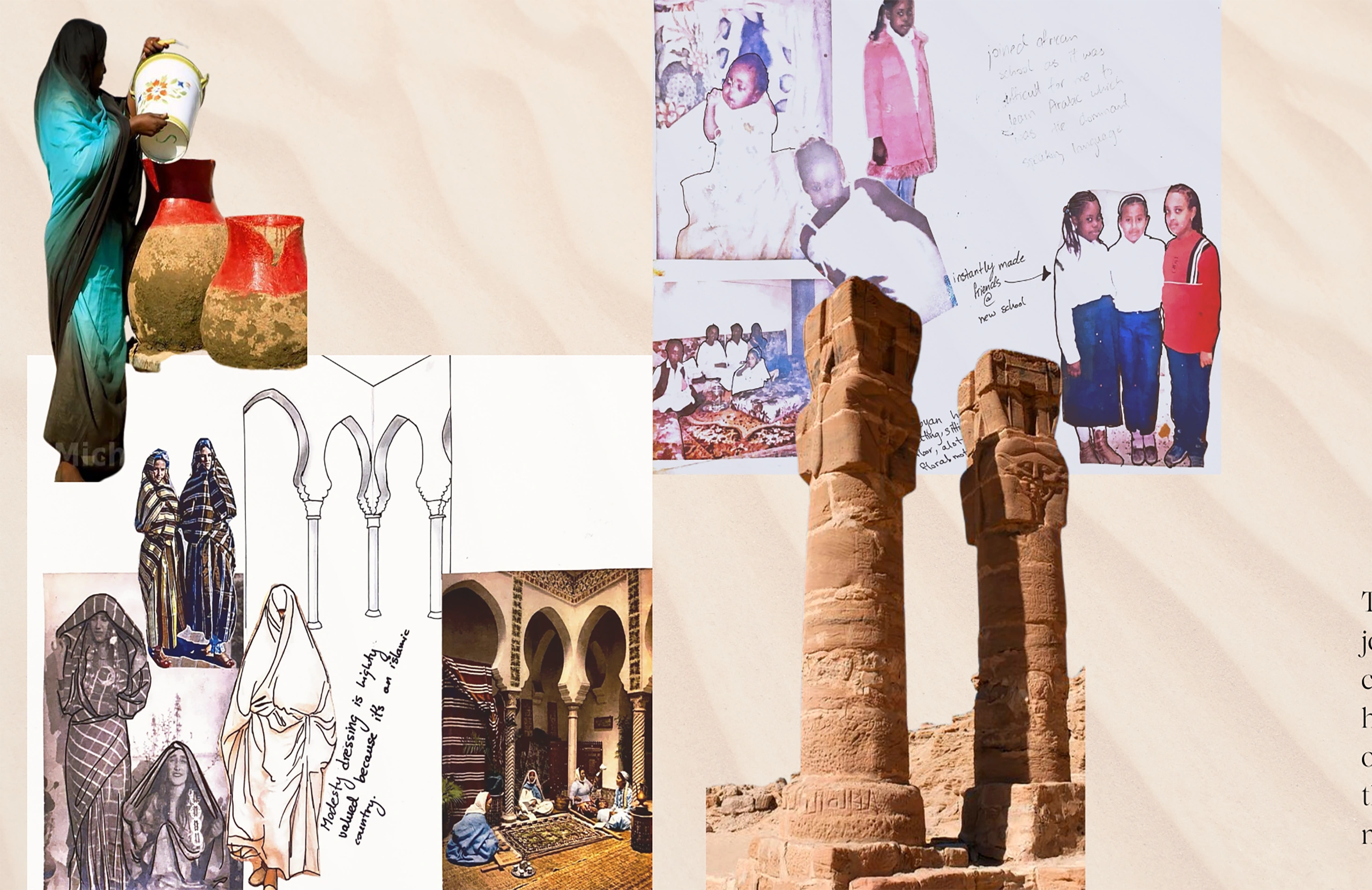 This collection is inspired by my personal journey travelling from Sudan to Libya by road—a passage marked by vast landscapes, shifting identities, and the quiet resilience of navigating unfamiliar worlds. Each piece in the collection reflects a fragment of that transformative experience, where the textures of desert life blend with the emotional terrain of migration and adaptation.