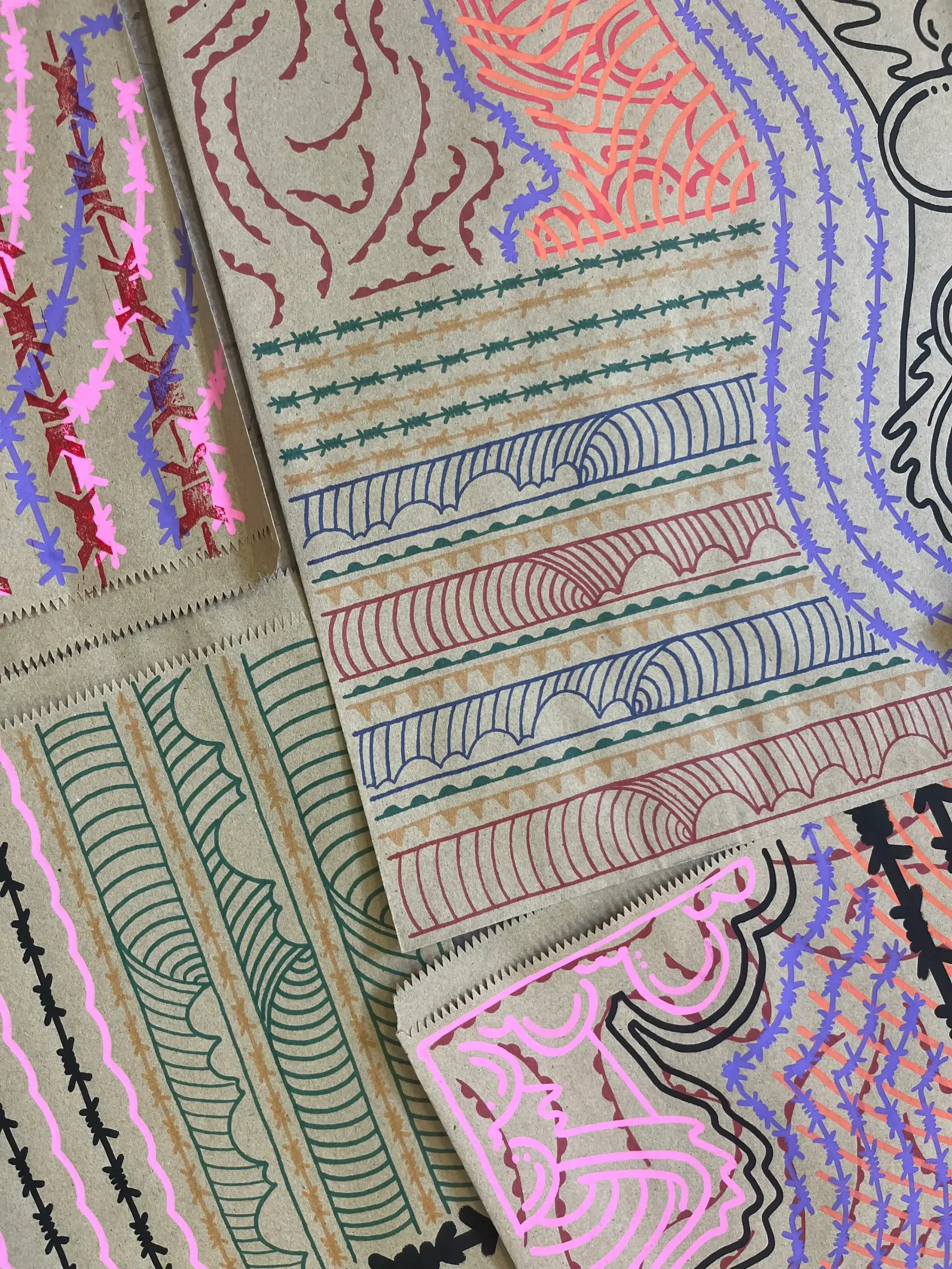 At its core, the project reflects on the tension between freedom and violence, escape and inheritance. A key part of the work is a collection of 42 brown paper bags, each marked with symbols and icons drawn from both surf culture and the Troubles—wave patterns, petrol bombs, barbed wire, weather maps. These bags form a visual language that shifts between personal memory and historical reference, abstraction and documentation. Through this symbolic fragmentation, I explore how meaning is layered, distorted, and carried across generations.