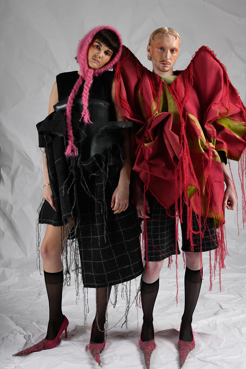 I was interested in how people move through the building in their own unexpected ways. I wanted to design garments that made people feel a little uncertain and prompt questions: what is that?, how was that made? I’ve explored this sense of something breaking down or not coming to fruition through the lens of our current sense of unease about the future.