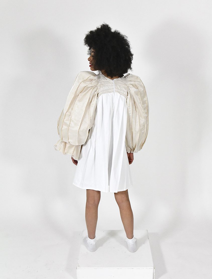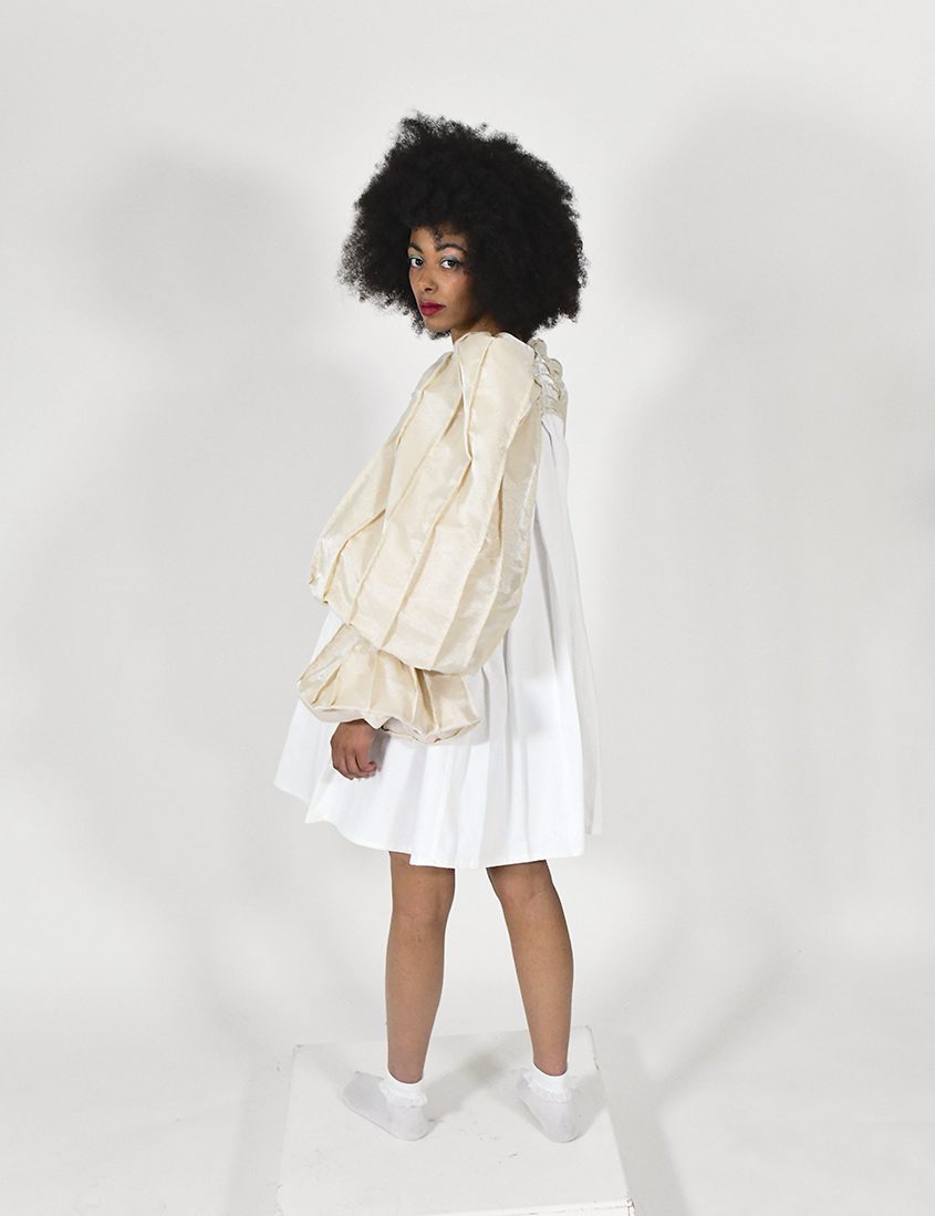 My collection is inspired by Japanese ceramic artists Noriko Kuresumi and Chika Inaba. I developed ceramic works myself where I explored shape and form. My collection traces the process of creating my ceramic works, using techniques such as twisting and turning I developed the shape of the garments. I focused on natural states of porcelain for my colour story . I used a mix of silk cotton, cotton and organza which was treated by pleating, pin-tucks, gathering and layering derived by the ceramic creations.