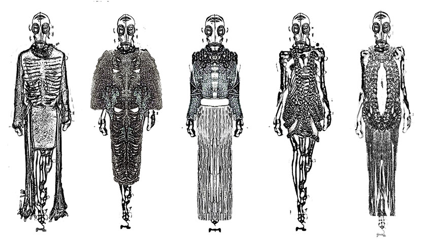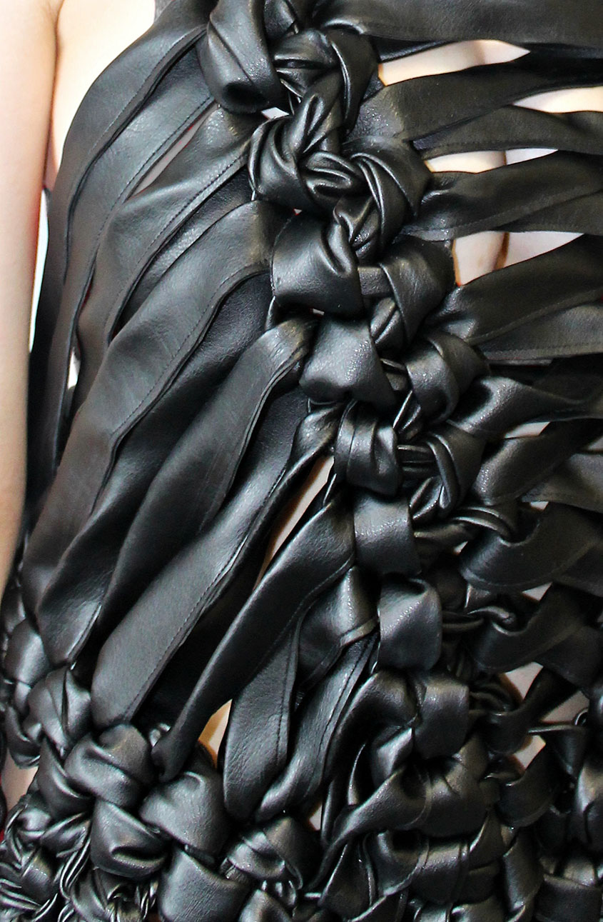 Deimos – AW17 collection, created by the macramé technique in black leatherlatte. Macramé is a form of textile-making using knotting rather than weaving or knitting. Its primary knots are the square knot and the forms of “hitching”: various combinations of half hitches. The inspiration came from the thought of war and brave women. The material that I have created is similar to the look of the catterpillar in the tank. These clothes show a strong and sexy rebellion that came from a different world where war was taking place. Presenting the defiant futuristic fashion I wanted to show that women are in spite of all strong creatures that do not need the help of others. These rebellies have survived the war just like nowadays they still fight for their own. I believe in them and I support them and this collection is dedicated to them, women.