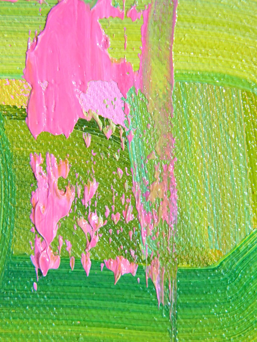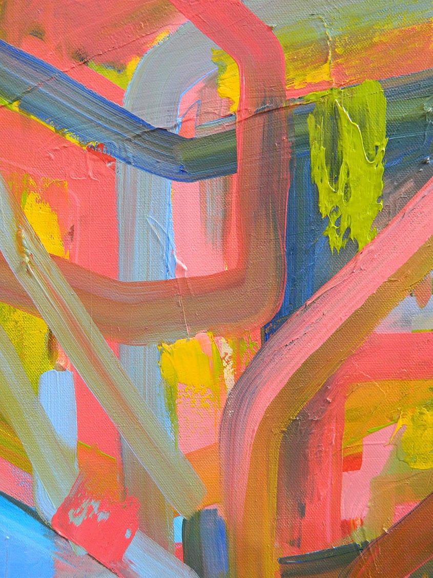 My paintings are inspired by Brutalist architecture. Many buildings associated with this architecture are very clinical and business related, often described as dystopian and uncanny in appearance and my work contradicts such serious associations. The harsh solid architecture has been transformed into a kaleidoscope of colours, lines and waves. The colours are of huge contrast in comparison to their origin and totally alter the renderings of the urban buildings and create a vibrant, toxic and bright pallet filled with energy and movement.