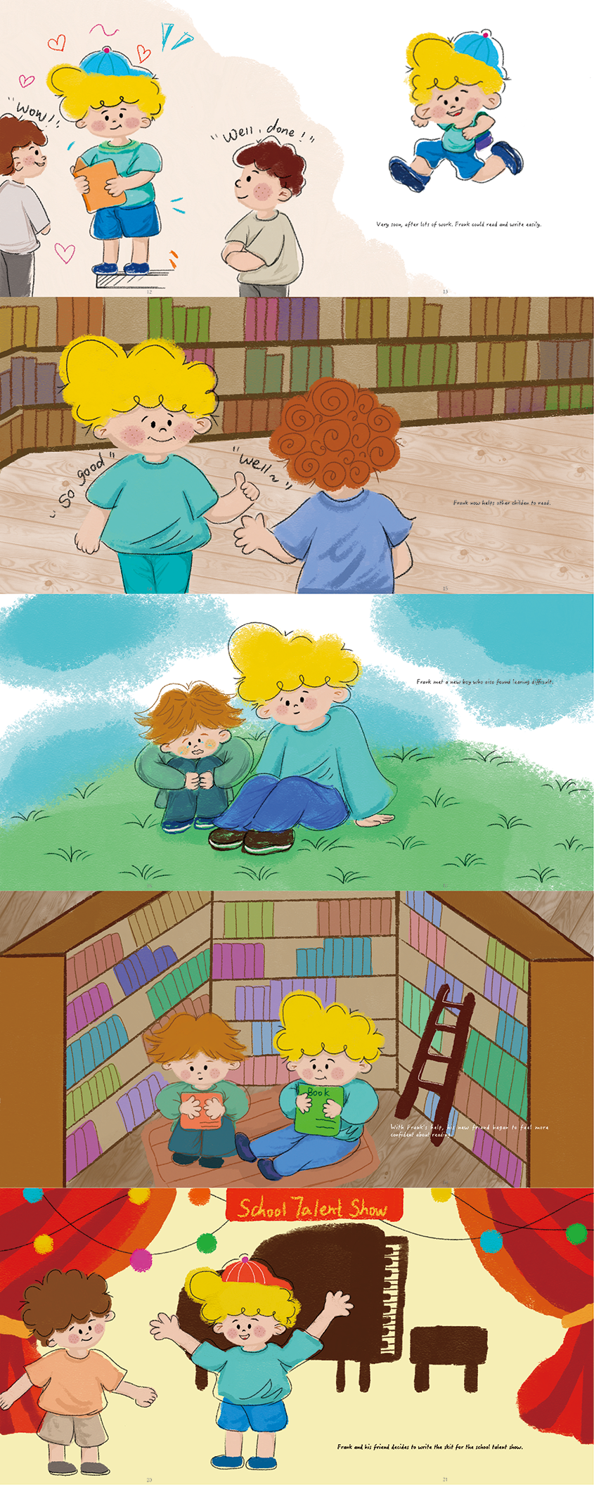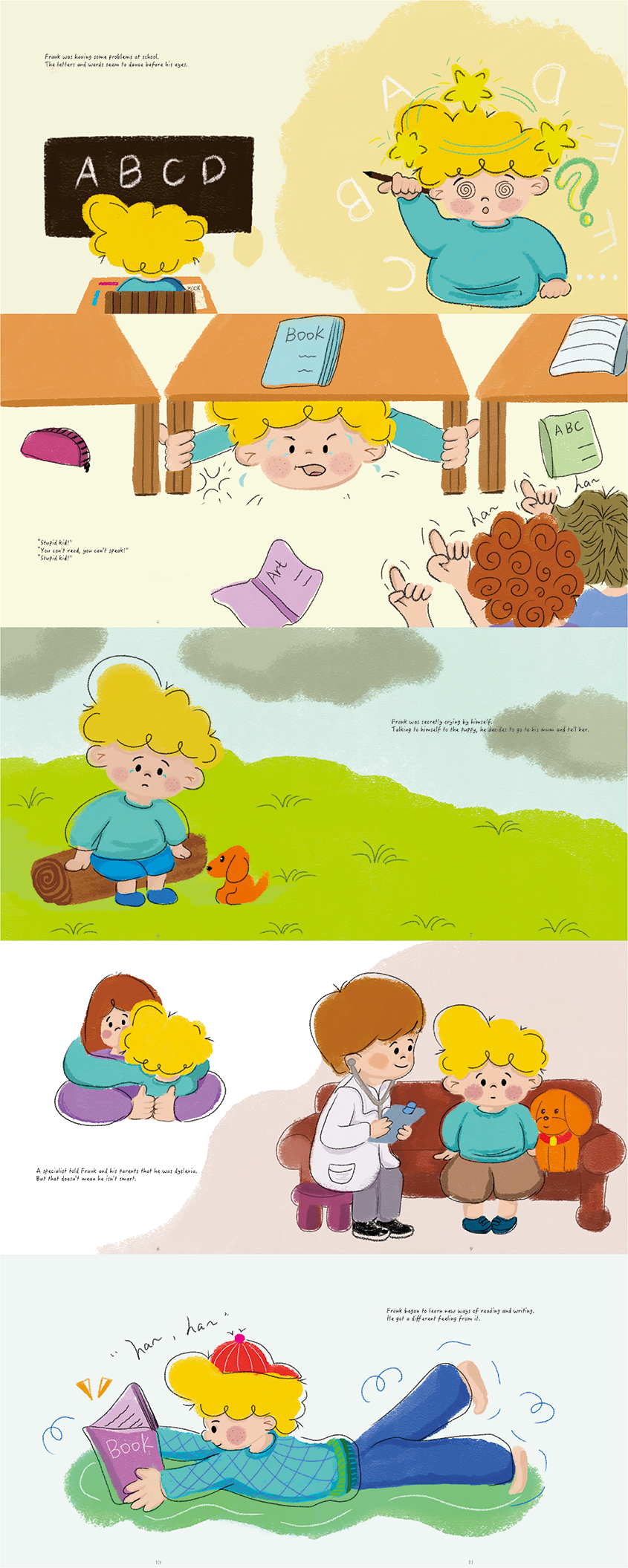 In order to help children with dyslexia, the designer has specially designed the storybook “I am not stupid kid”, in which the main character Frank is also a dyslexic child, from the beginning he found out that he could not read and write and was teased by his classmates for being a stupid child, he courageously complained to his parents and went to see a doctor to read in a special way, which changed the phenomenon. Frank helps his classmates around him, thus gaining their appreciation. He proves that he is not a stupid kid by his own efforts. Designer through this design, to help reading children patients should not be afraid of encountering problems, to go and parents teachers and friends to communicate in time. Accept imperfection and change the present.