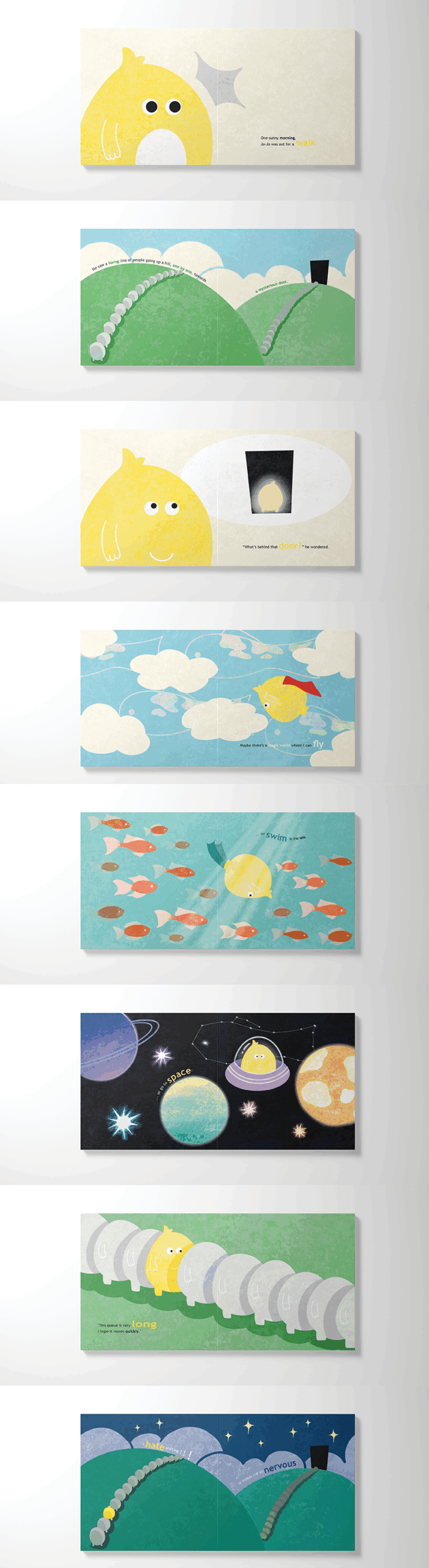 Through the simple story and painting style, the designer shows the audience that there is no need to be overly anxious about many things and that the end is not as bad as one thinks. The designer hopes everyone can be as brave as Jo-Jo to come through that door.