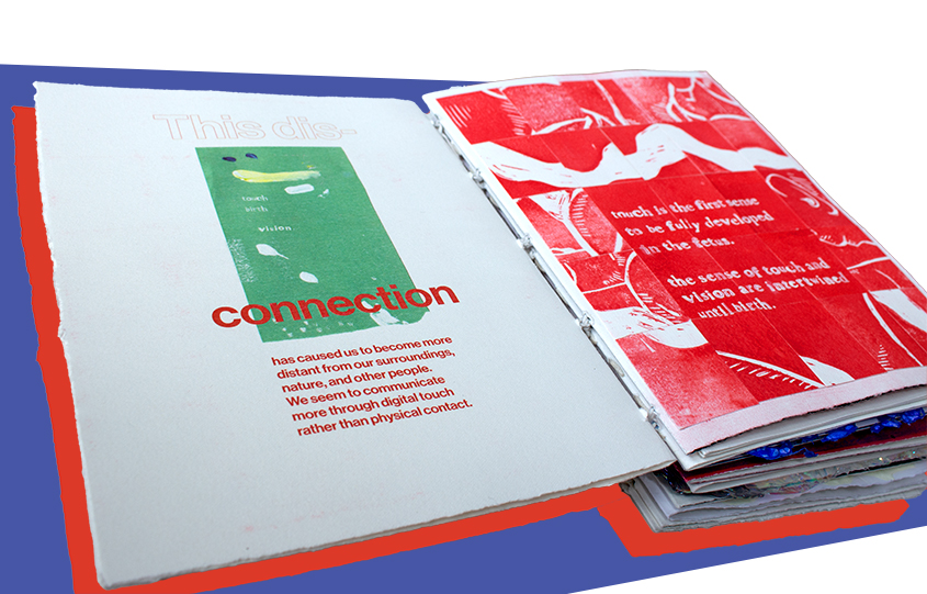The final book design “OUT OF TOUCH OUT OF MIND” explores the idea of disconnecting from the digital world and reconnecting with our senses. Through the use of various sensory stimuli, the book’s 41 pages aim to provide a more immersive and meaningful experience for the holder. Creating a book without relying heavily on digital tools was a deliberate choice, as it aimed to highlight the importance of genuine interaction and communication that can be derived from physical media.