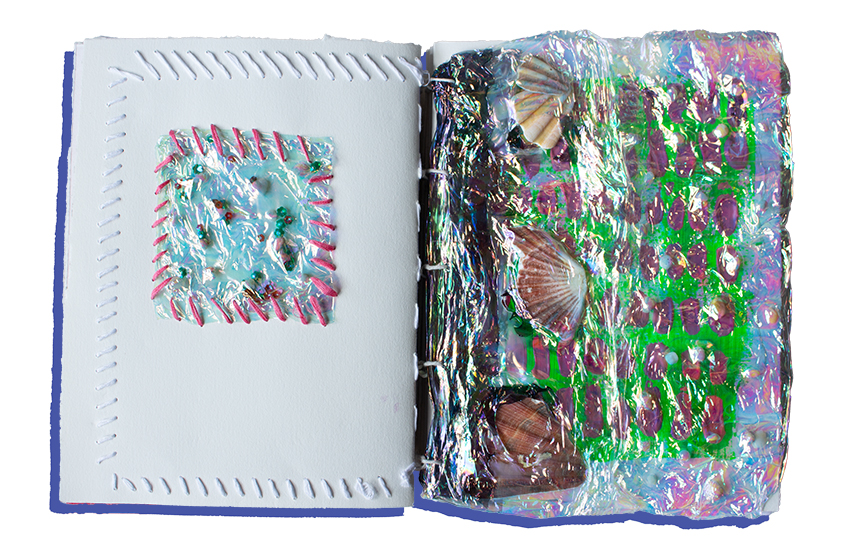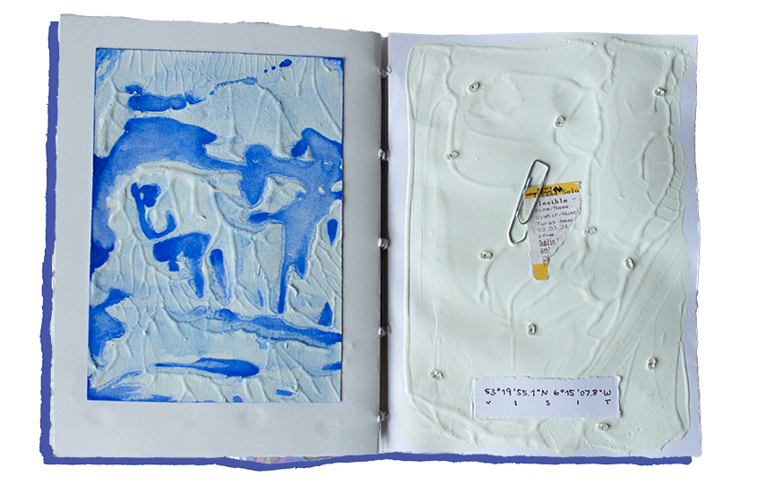 Several techniques were used for the signatures and pages of the book including painting, glueing, sewing, photography, typography, cyanotype, lino print, and working with different polymers.